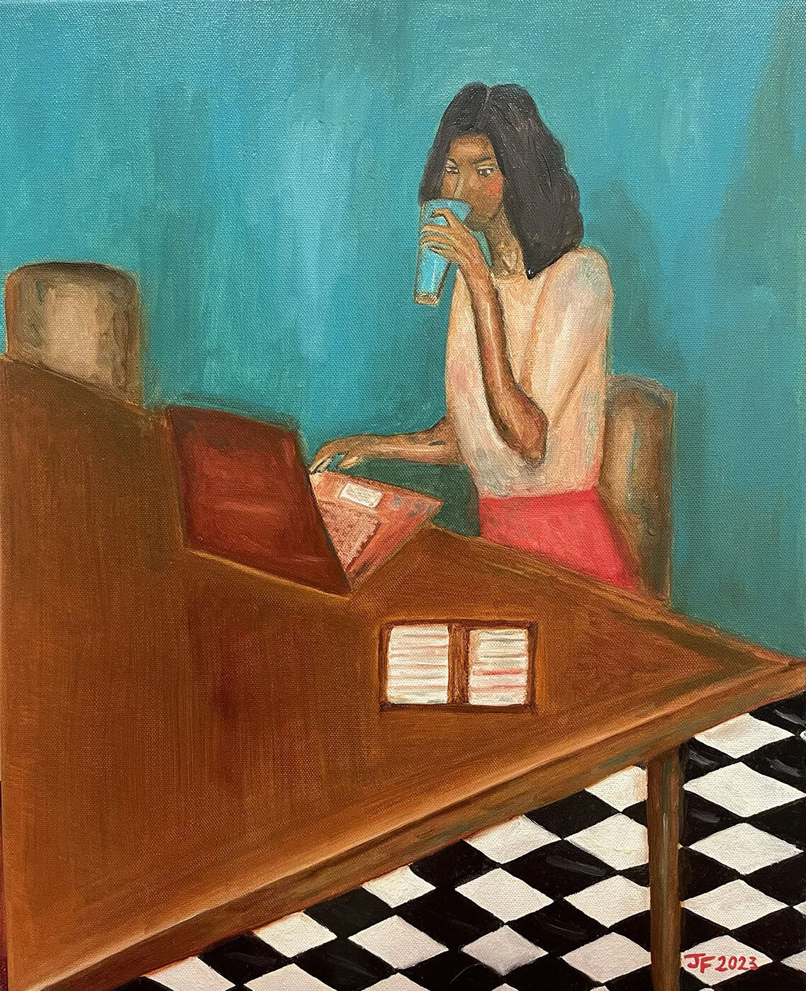 This captivating piece beautifully encapsulates the profound experience of working from home, shedding light on the often poignant sense of isolation that accompanies it. Drawing inspiration from years of personal encounters with the home office, this artwork resonates with the universal journey of countless women who have navigated the delicate balance of working from home, reaping its numerous advantages, especially in the realm of family life. However, this intricate tapestry of daily life also carries the weight of social seclusion.